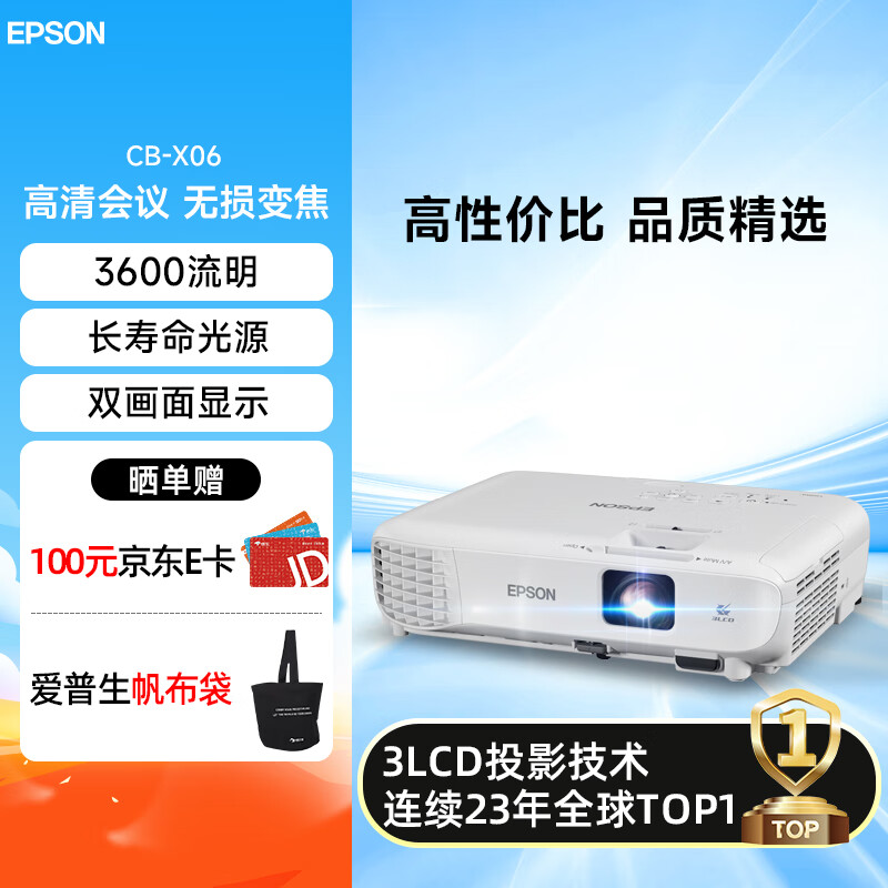 爱普生(EPSON) CB-X06 投影仪 投影机办公 培训(标清XGA 3600流明 滑动镜头盖)价格:3399.00元!