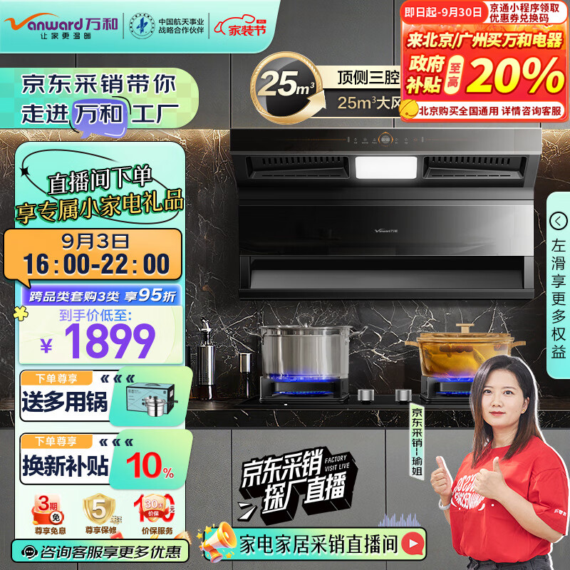 万和(Vanward)顶侧双吸油烟机 三腔直流变频抽油烟机 25m3/min大吸力 1000Pa风压 家用自清洗油烟机 WL860价格:1899.00元!