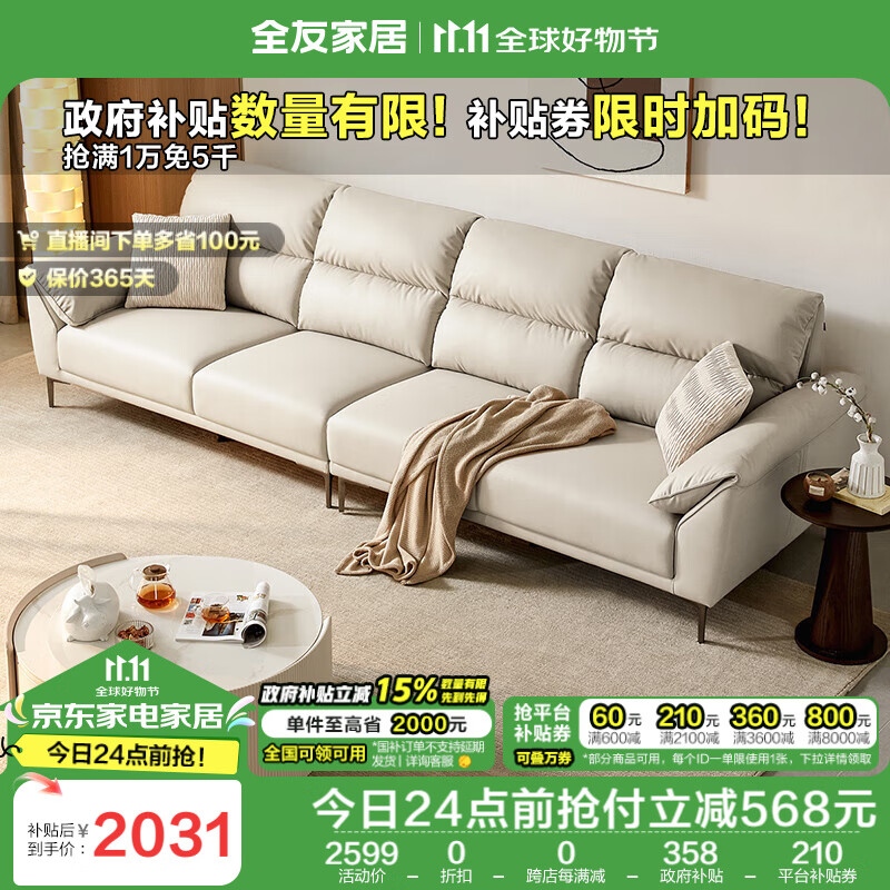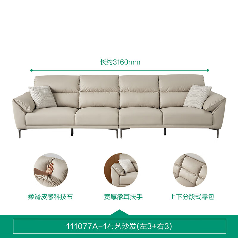 全友家居 现代简约大象耳朵豆腐块直排沙发家具科技布沙发客厅111077价格:2599.00元!