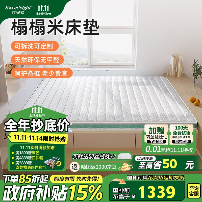 Sweetnight榻榻米床垫天然椰棕床垫10cm床垫子 可定制甜秘密丹左B款 1.2x2米价格:1339.00元!