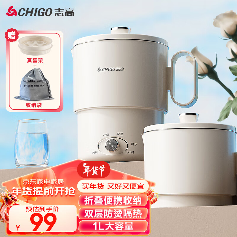志高(CHIGO)便携式烧水壶 1L电水壶折叠不锈钢水壶 烧水杯旅行出差家用水壶双层防烫电热水壶泡面杯FZB-EK02价格:99.00元!
