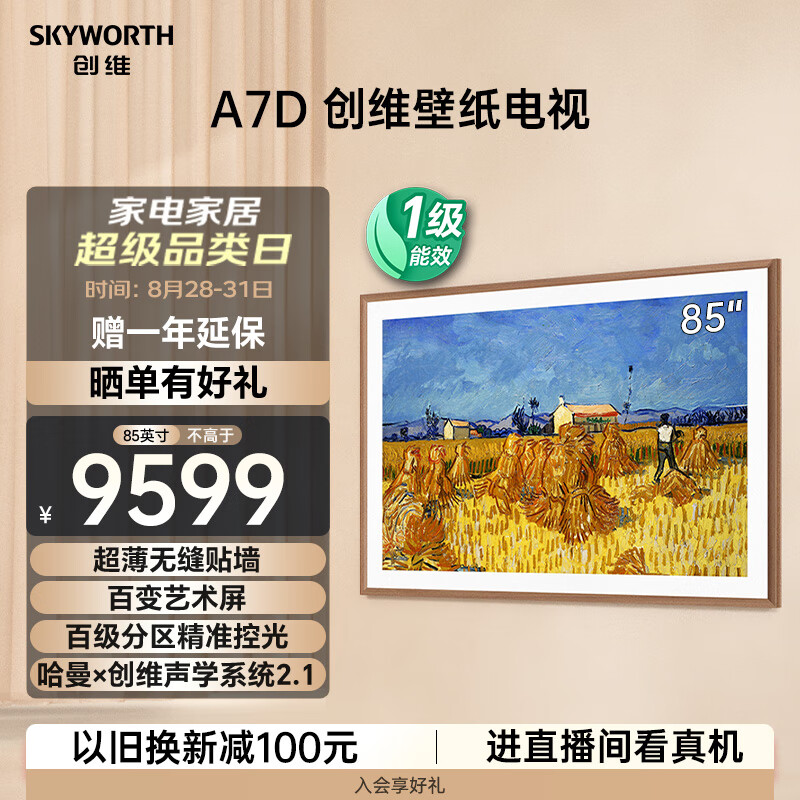 创维壁纸电视85A7D 85英寸超薄壁画艺术电视机 无缝贴墙4K高清 288Hz高刷巨幕大屏80-100英寸价格:9599.00元!