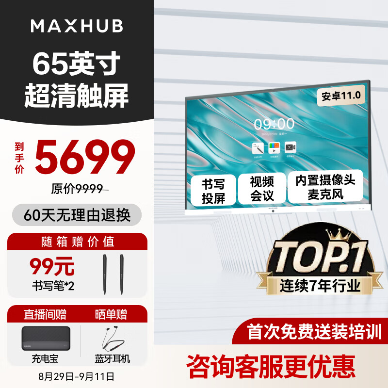 maxhub新锐65英寸会议平板一体机 智慧屏高清视频投影触摸触控会议电视一体机 办公教学多媒体电子白板黑板价格:5699.00元!