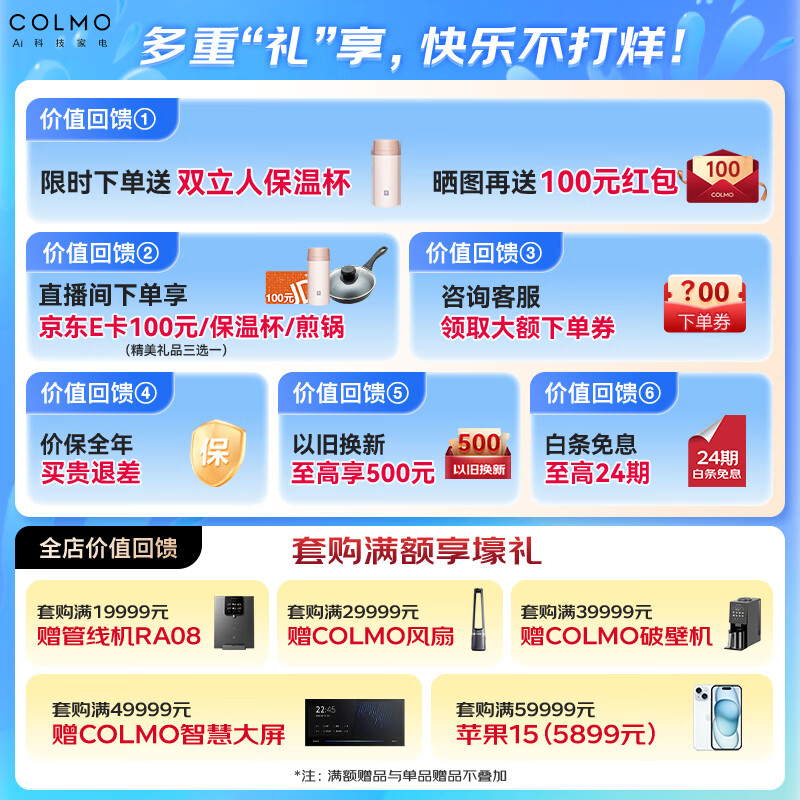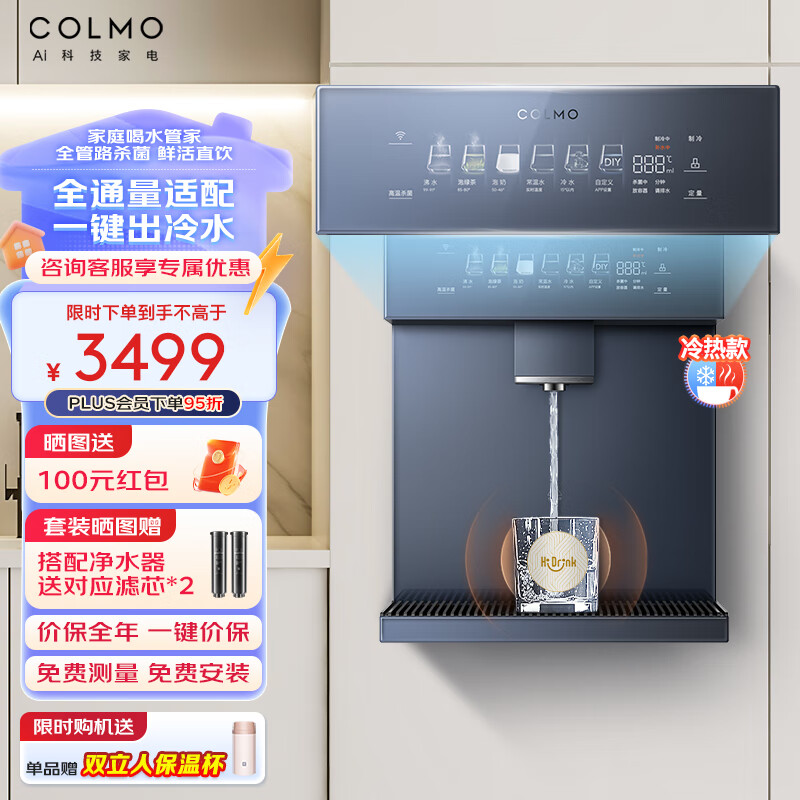 COLMO管线机壁挂式直饮机DA05 家用制冷加热一体机 全通量匹配高温杀菌智能感应取水多档水温调节价格:3400.00元!