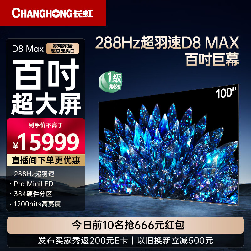 长虹电视100D8 MAX 100英寸4K MiniLED巨幕 98英寸+ 智能液晶会议平板电视 北京以旧换新一级能效价格:15999.00元!
