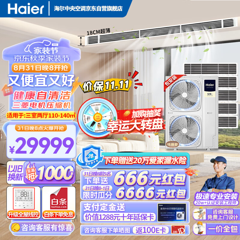 海尔(Haier)中央空调一拖五风管机7匹小多联一级能效全直流变频嵌入式智尊+ RFC180MXSAVA(G)价格:29968.00元!