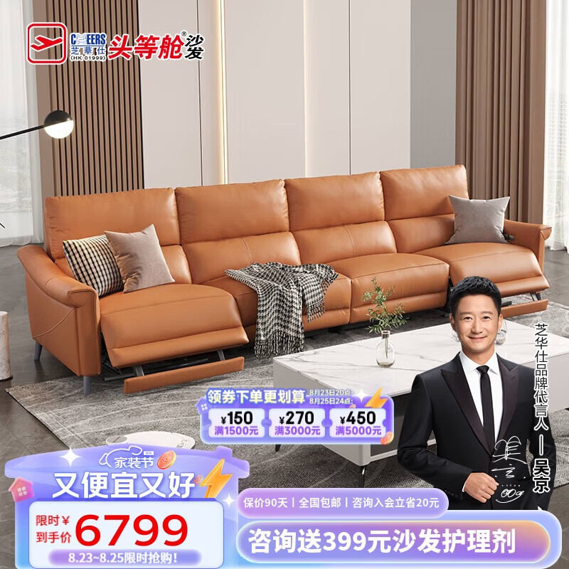 芝华仕(CHEERS)头等舱零靠墙现代简约真皮电动功能沙发客厅芝华士50611B橙意四A价格:6799.00元!