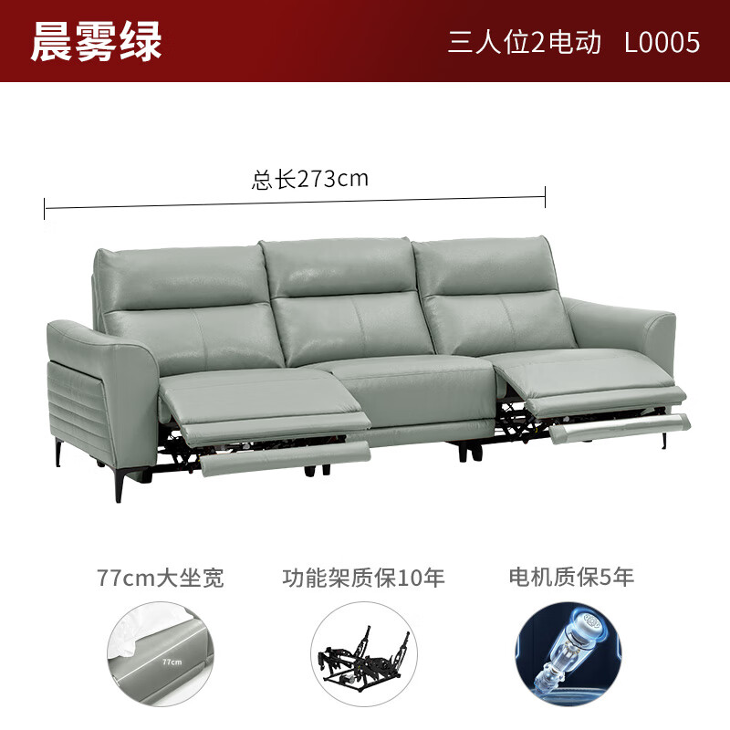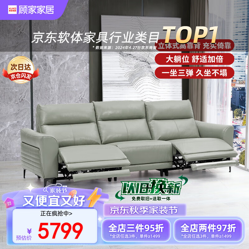 顾家家居(KUKA)头层牛皮沙发客厅高脚功能沙发小户型6055绿3双2电动【京仓闪发】价格:5793.20元!