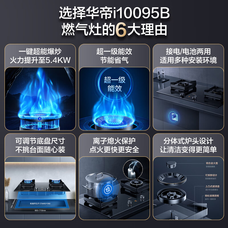 华帝(VATTI)燃气灶 煤气灶 嵌入式台式双灶具灶台 华帝官方一级能效 可调节开孔尺寸 5.4kW爆炒灶-95B-天然气价格:1999.00元!