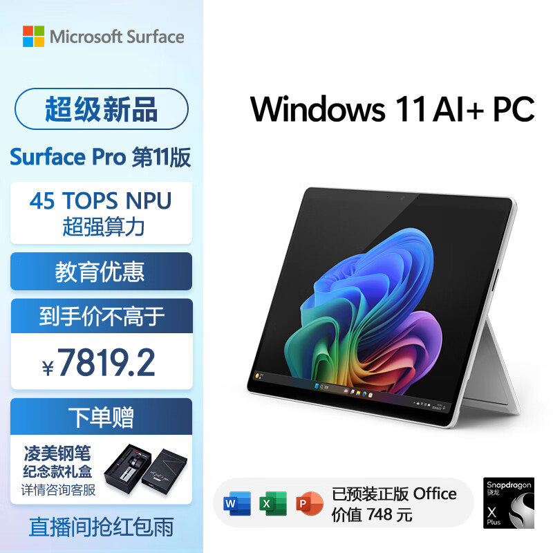 微软(Microsoft)全新Surface Pro第11版 骁龙X Plus 16G 256G 亮铂金二合一平板笔记本电脑 AIPC Pro 11教育优惠价格:7819.20元!