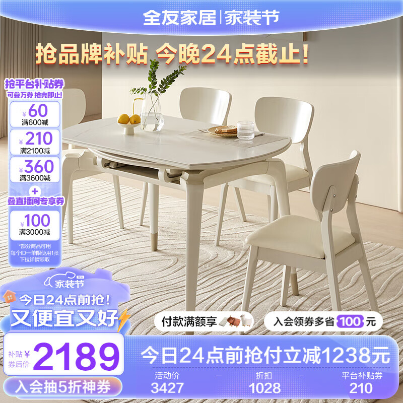 全友家居 餐桌现代简约岩板餐桌可圆可方伸缩功能吃饭桌子家具DW1121B价格:3427.14元!