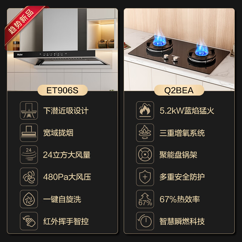 海尔(Haier)油烟机 抽油烟机燃气灶套装 新欧式深潜近吸24立方挥手感应 67%高热效烟灶套装ET906S+Q2BEA天价格:2887.00元!