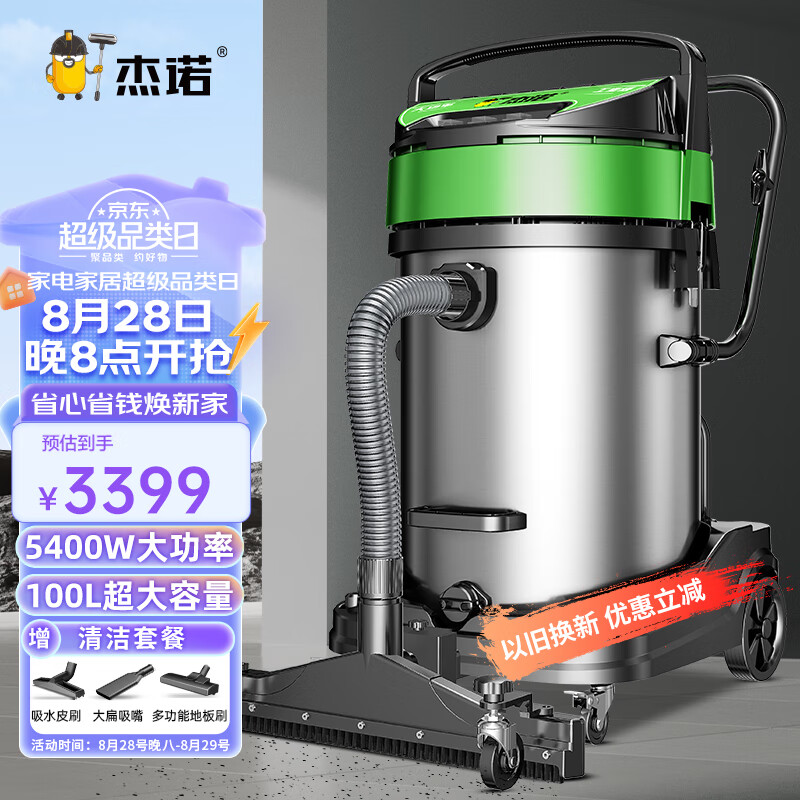 杰诺5400W大功率强大吸力干湿两用商用工业吸尘器工厂车间大型厂房粉尘吸水机JN-301T边推边吸价格:3399.00元!