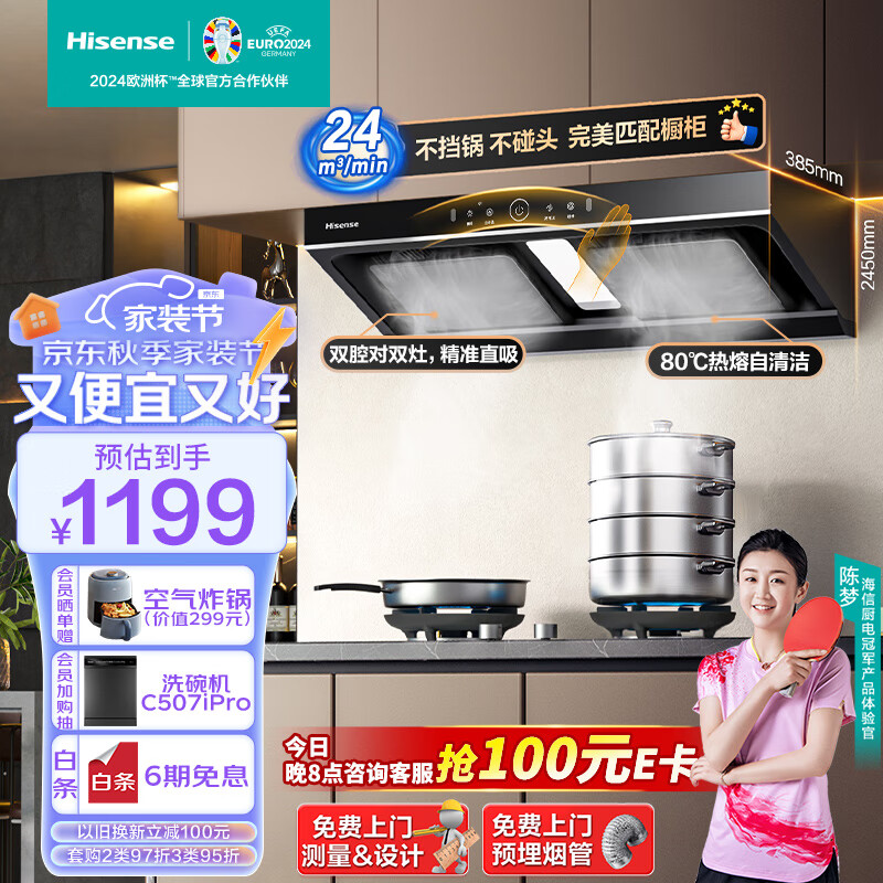 海信(Hisense)抽油烟机欧式顶吸超薄平嵌家用排烟机云魔方 24立方大吸力挥手自清洁跨界双腔排吸烟机以旧换新T1价格:1399.00元!