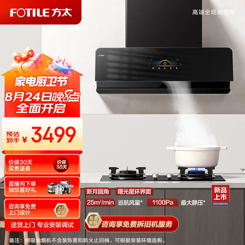方太(FOTILE)新月抽吸油烟机F1S系列 家用侧吸变频25巡航风量烟灶联动单烟机F1S价格:3499.00元!