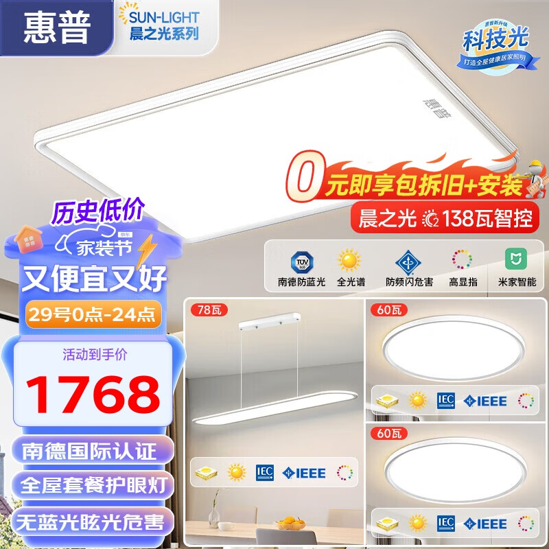 惠普全光谱护眼吸顶客厅卧室灯米家现代简约灯饰中山灯具全屋套餐J价格:3280.00元!
