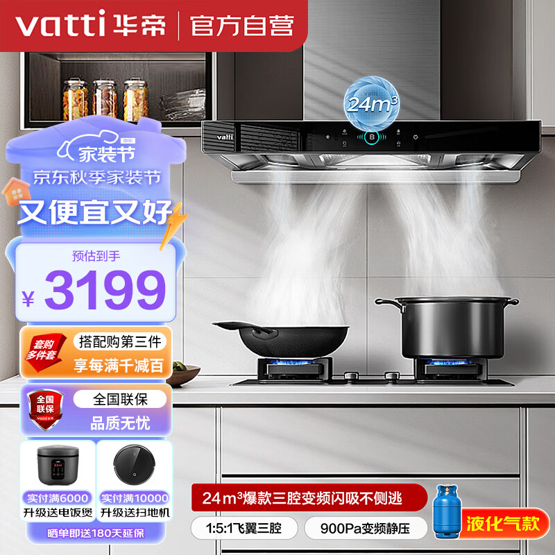 华帝(VATTI)抽油烟机家用顶侧欧式变频大吸力烟机燃气灶烟灶套装24风量自动清洗吸油烟机灶具套装i11206液化气价格:3299.00元!