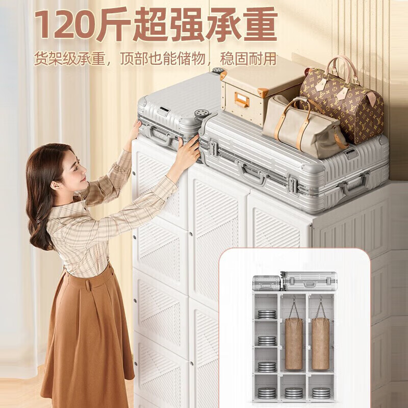 3、外观样式很好看,承重能力也不错,容量很大能装下很多衣物和一些杂品,适用于阳台和小房间摆放,安装也很简单一拉一拍简单组装就完成了,很喜欢。
