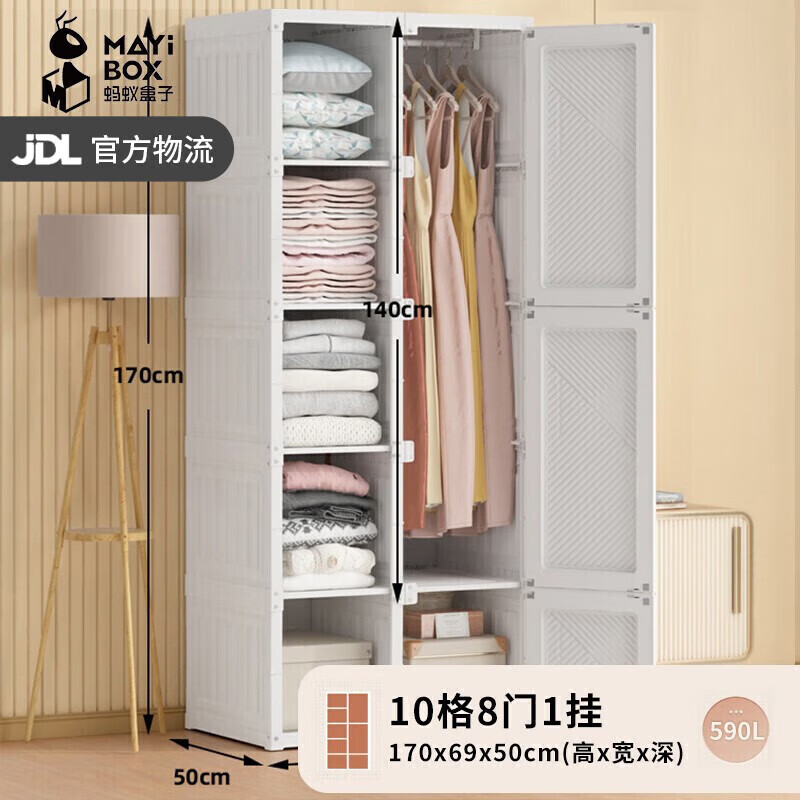 蚂蚁盒子(MAYIHEZI)免安装衣柜简易衣柜家用卧室出租房塑料柜收纳衣橱白板10格8门1挂价格:489.00元!