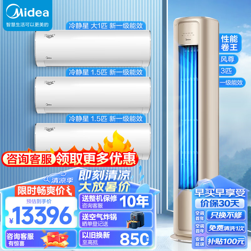 美的(Midea)新一级能效 空调套装 三室一厅套餐 风尊+冷静星 变频冷暖家用空调 72MZB1+35PH200(2台)+26PH200价格:13296.00元!