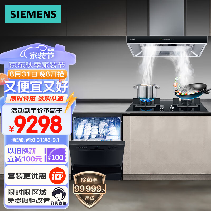 西门子厨电套装 14套大容量家用洗碗机 吸油烟机灶具套装(天然气)SJ23HB66KC+951W+ER8KJF23MP价格:9297.00元!
