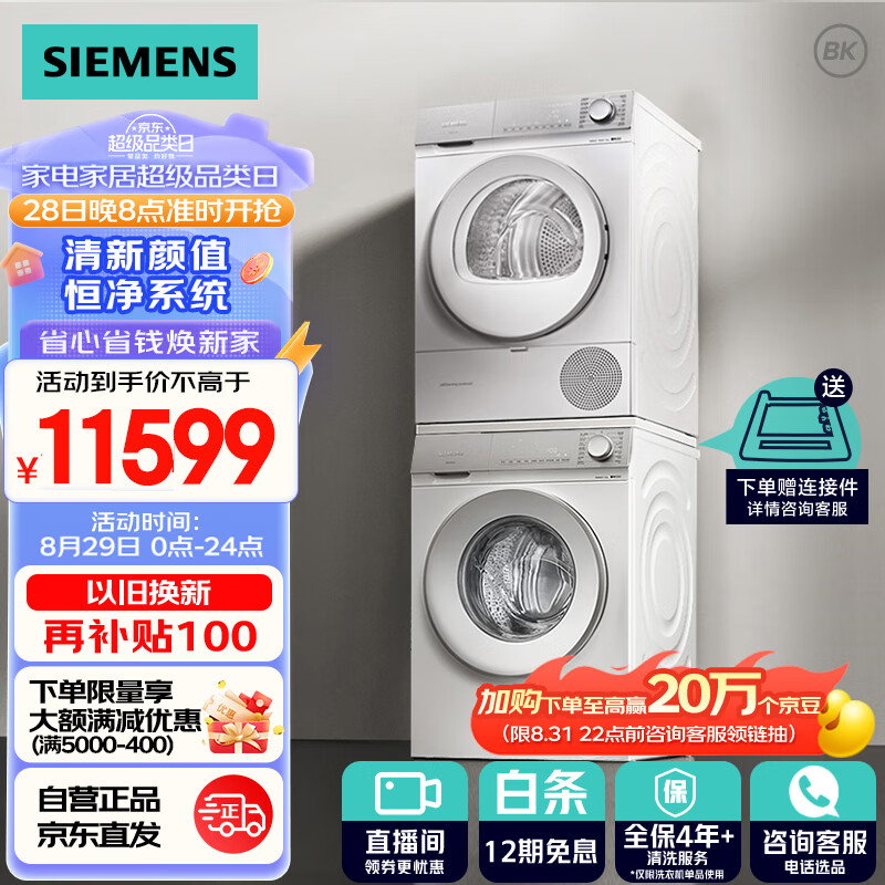西门子(SIEMENS)轻颜洗烘套装 10kg智能除渍滚筒洗衣机全自动+10kg热泵烘干机家用 WG54B2X00W+WQ55B2D00W价格:11999.00元!