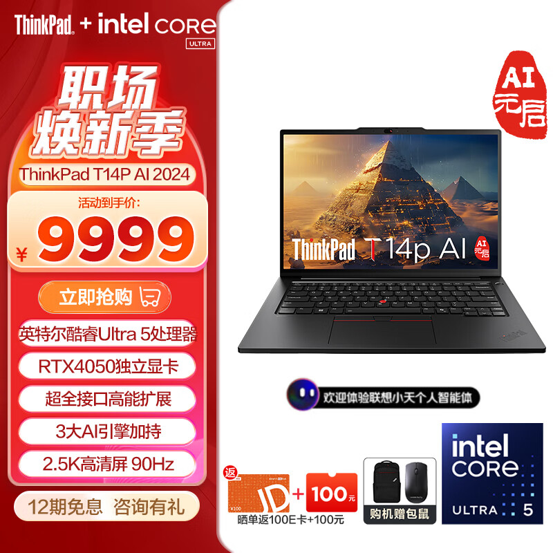 ThinkPad T14p AI 2024 全新酷睿Ultra处理器 联想高性能标压工程师本笔记本电脑办公轻薄本 Ultra 5-125H 16G 1T独显07CD价格:10499.00元!