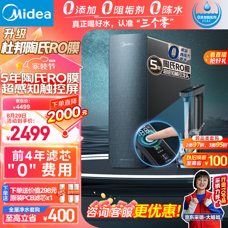 美的净水器家用净水机星河1000G PRO 5年长效陶氏RO反渗透净水器厨下式直饮机 鲜活零陈水智能触控屏价格:2499.00元!