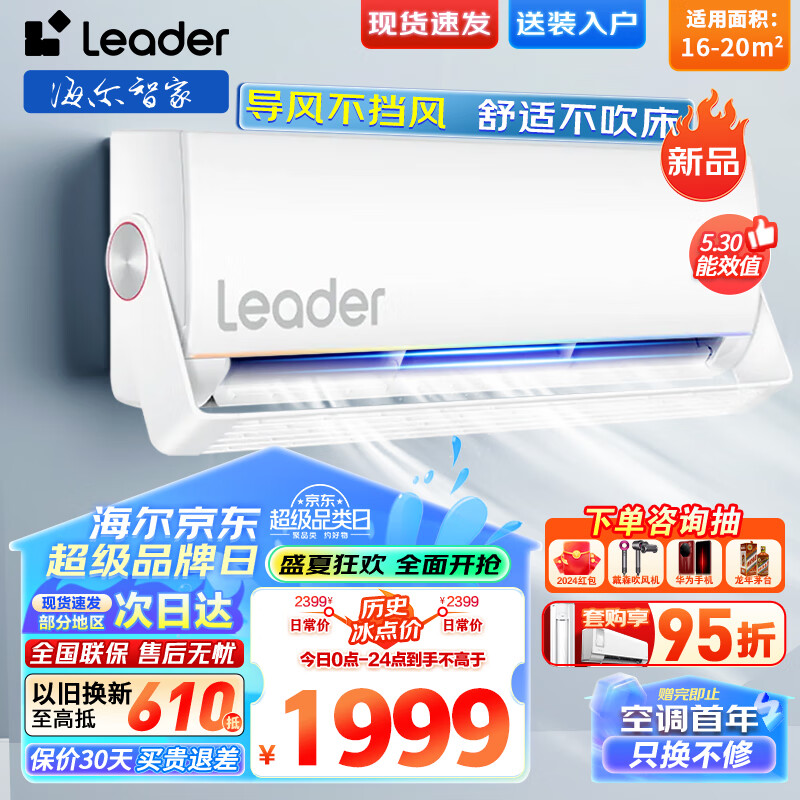Leader空调海尔智家出品1.5匹挂机旋翼防直吹挂机新一级能效 变频冷暖自清洁挂式急速变温35MUE81价格:1999.00元!