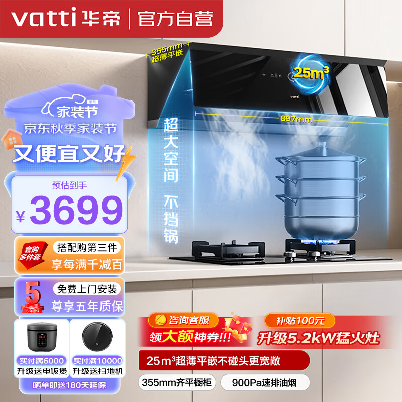 华帝(VATTI)官方抽油烟机家用超薄变频大吸力顶侧一体新侧吸25风量自动清洗烟机燃气灶具烟灶套装i111A2天然气价格:3899.00元!