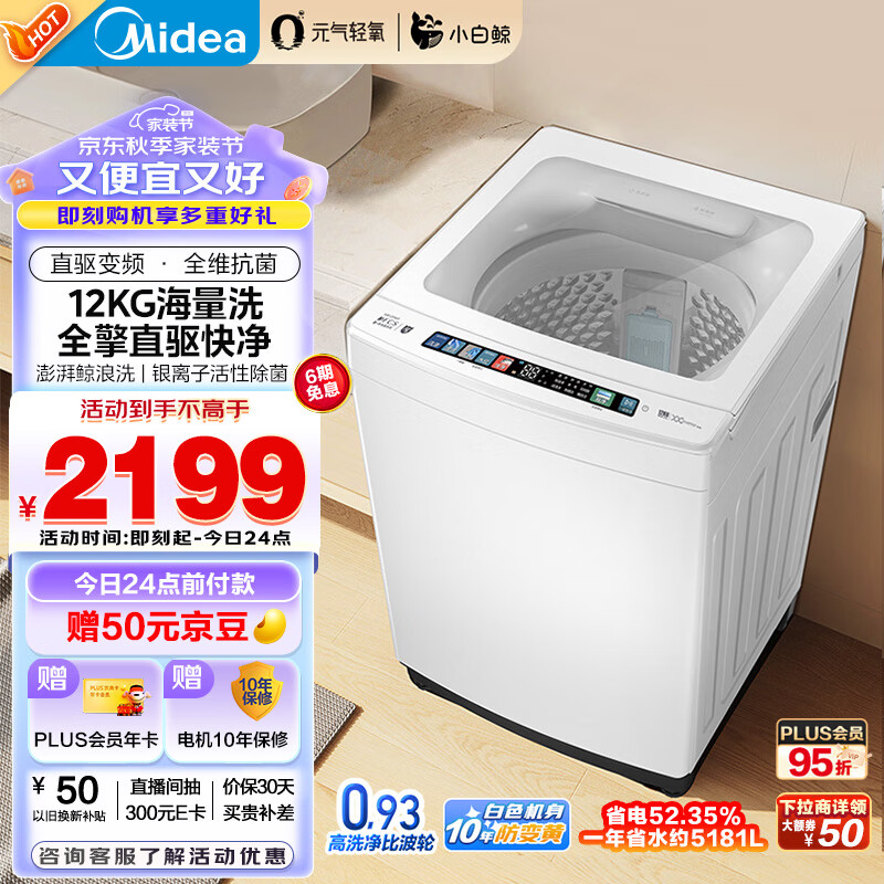 美的(Midea)波轮洗衣机全自动家用 小白鲸MB120WJ3 12公斤大容量 元气轻氧 全擎直驱快净 防变黄科技 无孔内桶价格:2199.00元!