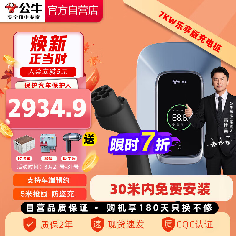 公牛(BULL)新能源汽车交流充电桩适配于小米su7汽车特斯拉比亚迪极氪问界小鹏蔚来等 7KW乐享款 30米送装一体价格:4194.00元!