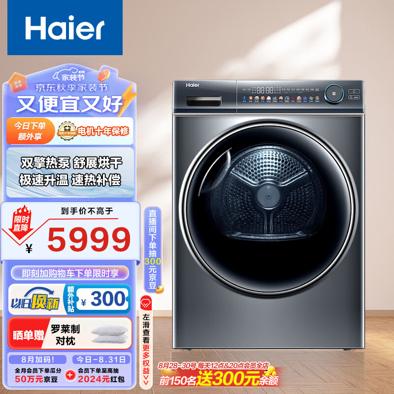 海尔(Haier)纤美烘干机家用 10公斤双擎热泵干衣机 空净过滤系统 静筒柔烘EHGS100FMATE81U1 以旧换新价格:5999.00元!