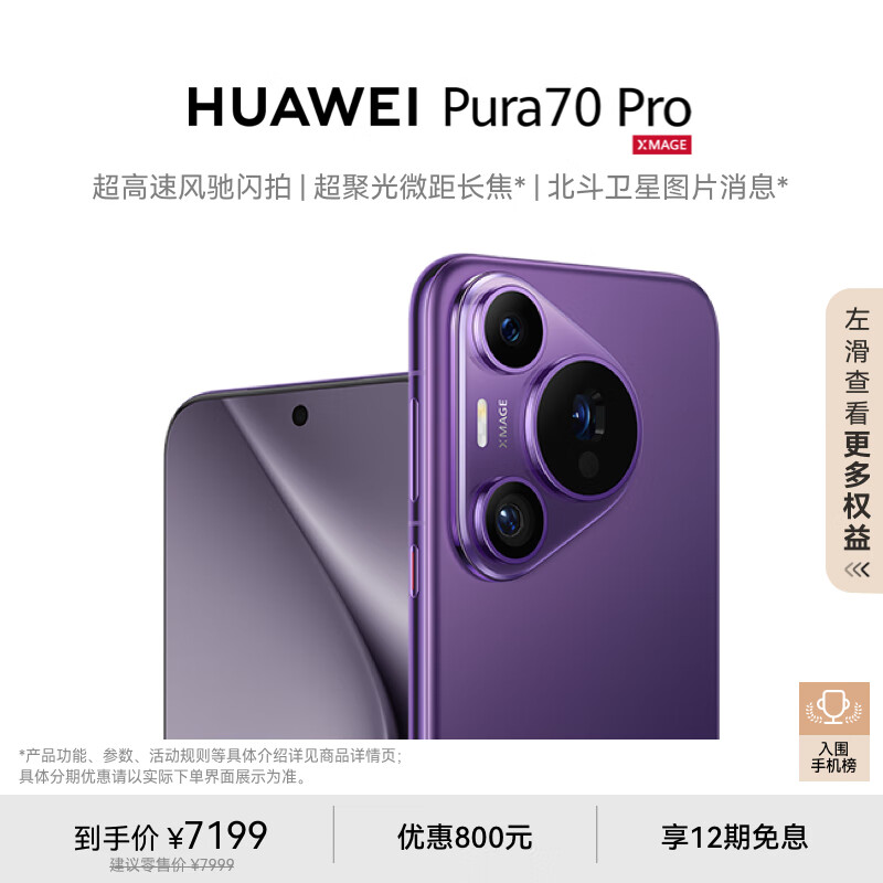 HUAWEI Pura 70 Pro 罗兰紫 12GB+1TB 超高速风驰闪拍 超聚光微距长焦 华为P70智能手机价格:7199.00元!