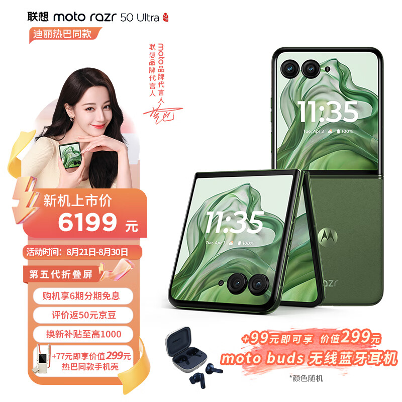 摩托罗拉 联想moto razr 50 Ultra 第五代折叠屏 4吋无界大外屏 双卡 5G手机 AI元启版 12+512GB 摩登艾绿价格:6199.00元!
