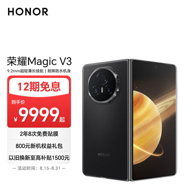 荣耀Magic V3 新款折叠屏 超轻薄长续航 耐摔防水机身 第三代骁龙8 16+512 绒黑色 拍照 5G AI智能手机价格:9999.00元!