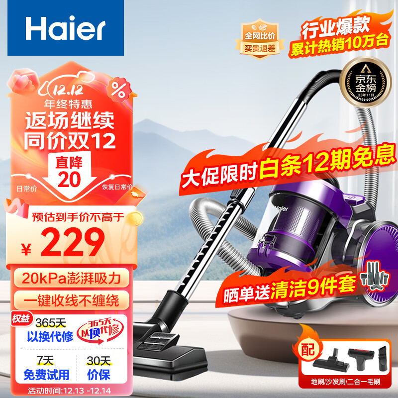 海尔(haier)吸尘器家用卧式大吸力 地板地毯清洁开荒保洁大功率家庭吸尘器 一键收线1207Z紫色价格:229.00元!