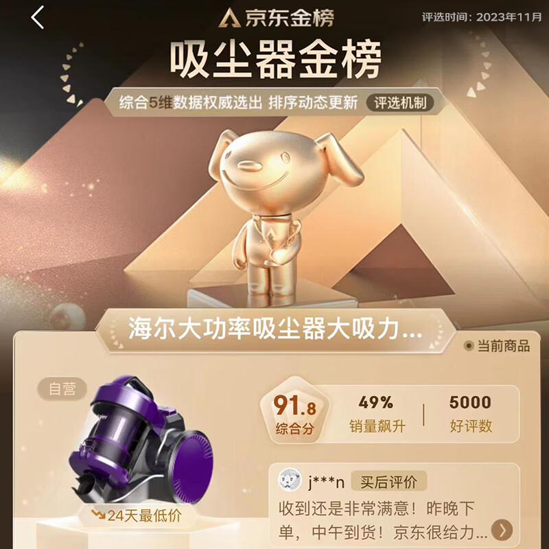 3、海尔的产品还是值得信赖的,家里正在做开荒保洁,主要是一些缝隙里有灰尘,所以决定购买一台吸尘器,选了几款,还是觉得海尔更好一些,事实证明确实不错,这款吸尘器吸力大,易清洁,一些大的颗粒也能顺利吸走,还有一键收线功能很亮眼,使用很方便,发货速度很快,包装完好。