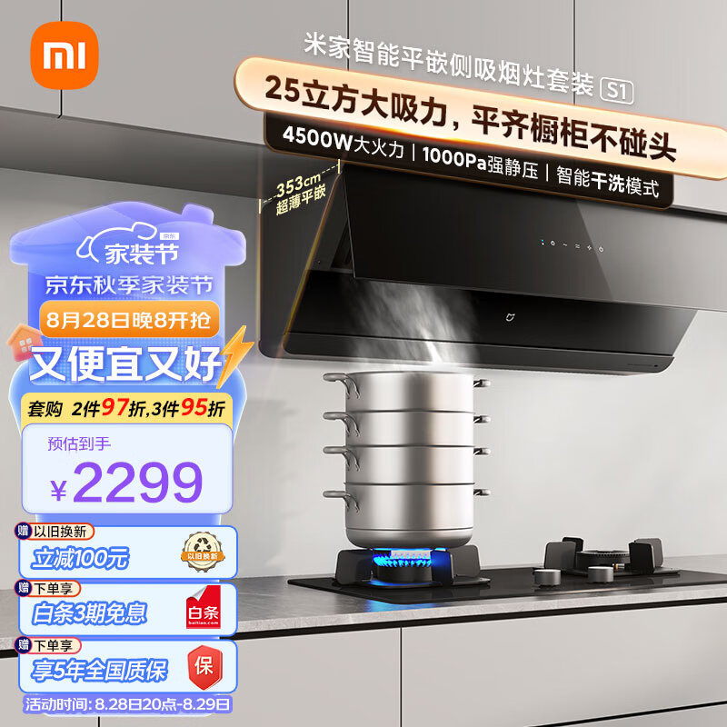米家小米智能平嵌侧吸油烟机S1 25大吸力小尺寸齐平橱柜烟灶联动抽油烟机燃气灶套装4.5kw(液化气)价格:2299.00元!