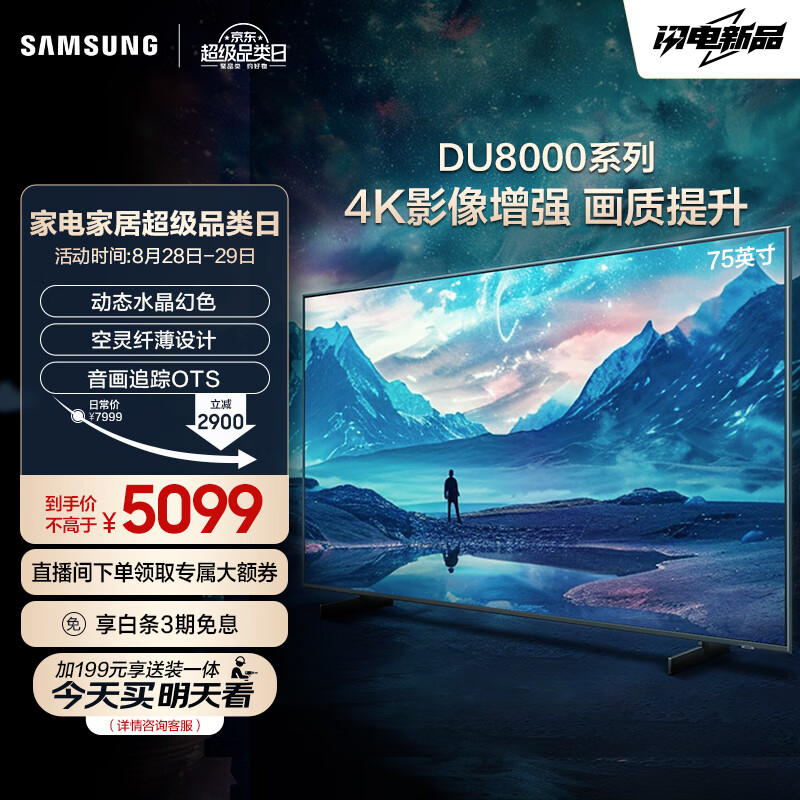 三星(SAMSUNG)75DU8000 75英寸 平板液晶AI电视 超薄4K AI智能补帧 无开机广告 UA75DU8000JXXZ价格:4999.00元!