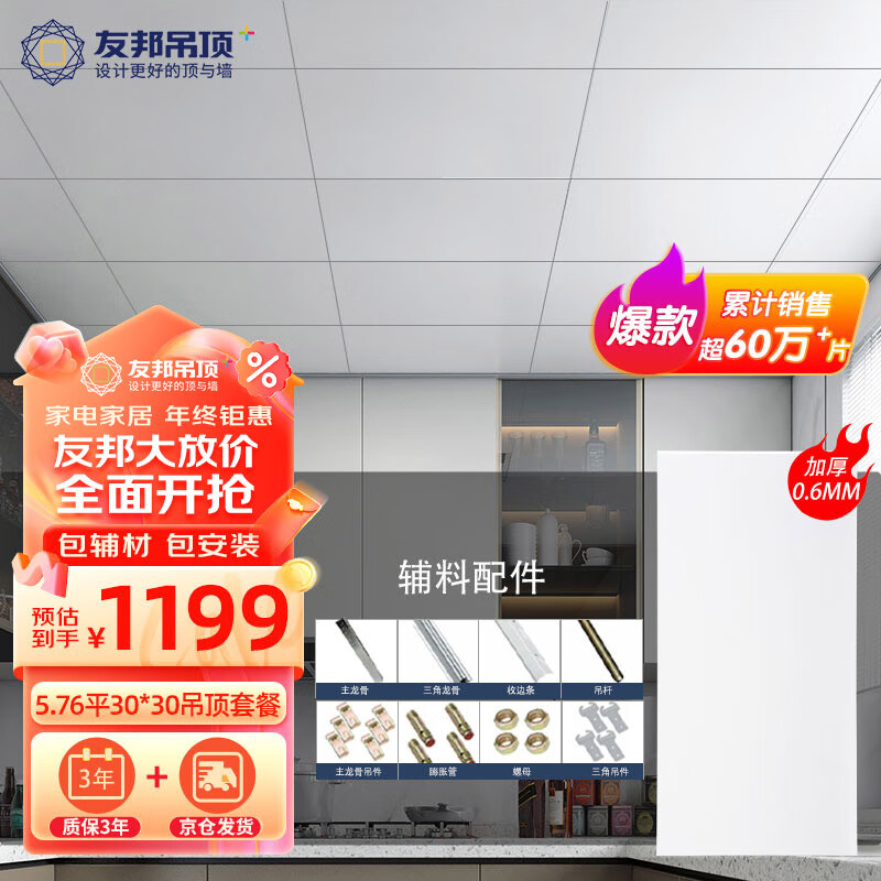 友邦(YOUPON) 集成吊顶铝扣板包安装300*600厨房阳台卫生间家用大板吊顶铝扣板 0.6mm厚|5.76平30*60哑光白价格:1199.00元!