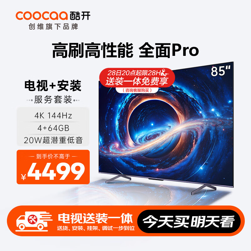 酷开【送装一体版】创维K3 Pro 85英寸电视 144Hz高刷 4+64GB 4K护眼 液晶平板游戏电视机85P3D Max价格:4499.00元!