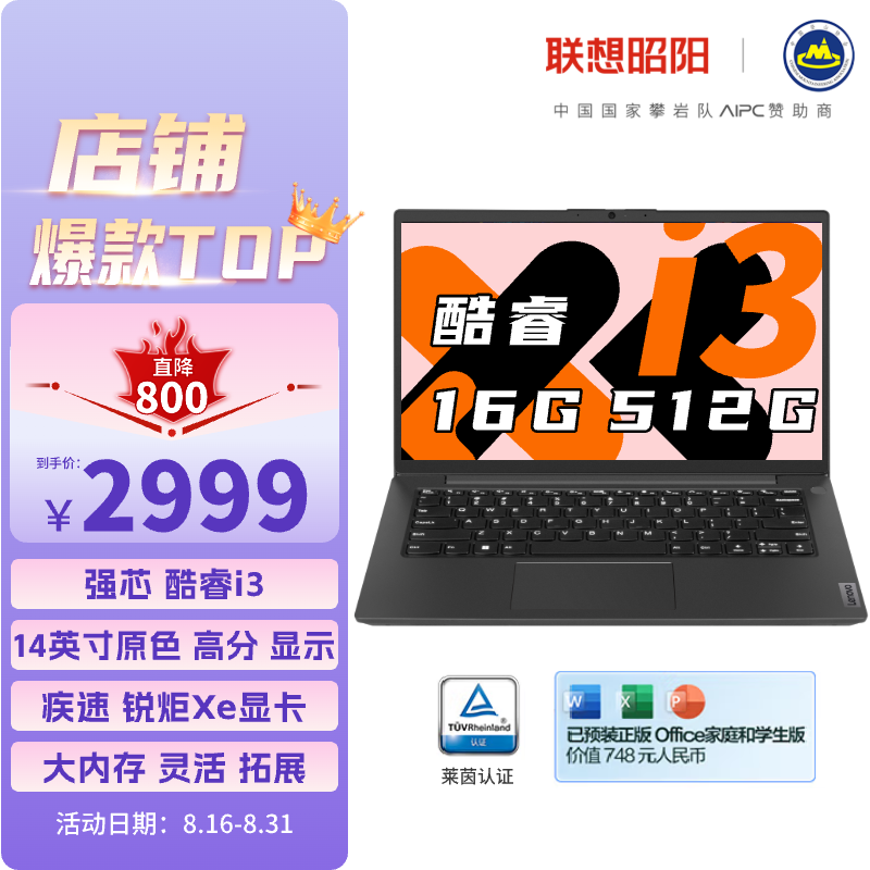 联想笔记本电脑 昭阳青春版轻薄本 英特尔酷睿处理器 14英寸高分屏 16G 512G 商务办公学生office价格:2999.00元!