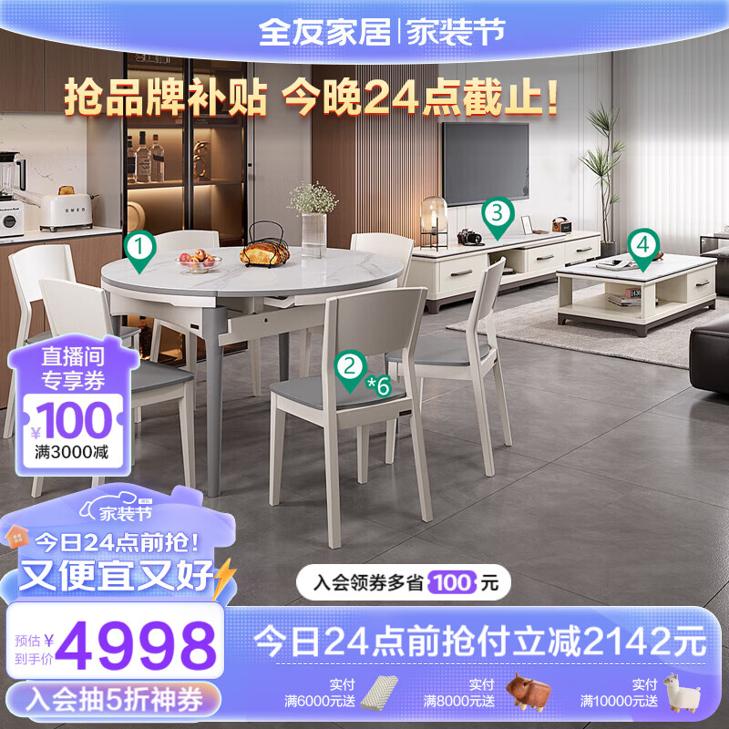 全友家居 现代简约家用客餐厅岩板茶几电视柜一桌六椅组合家具120709价格:7140.00元!