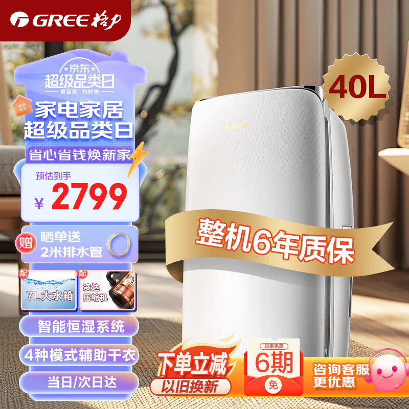 格力(GREE)除湿机家用抽湿机低噪 40升/天60~72㎡ 地下室卧室商用工业除潮除霉除湿器 智能控湿可干衣DH40EF价格:2799.00元!