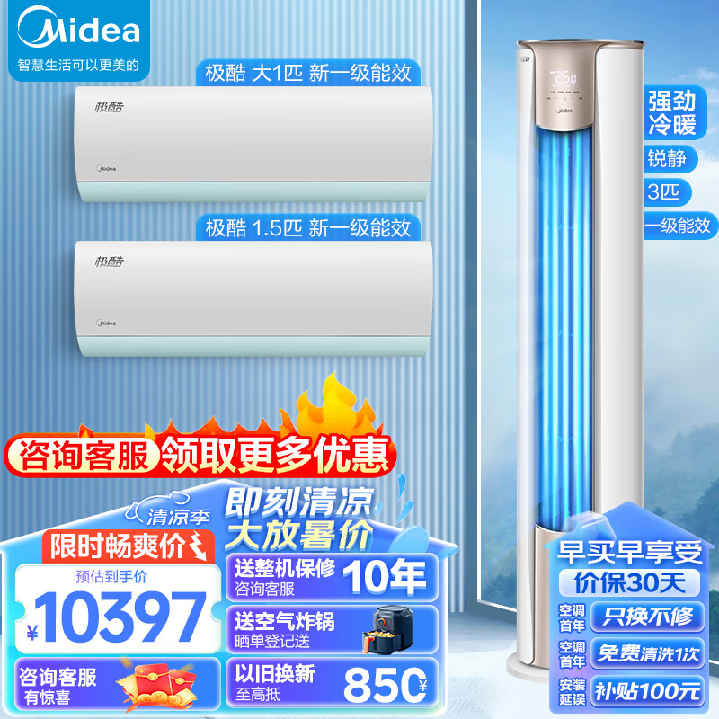 美的(Midea)新一级能效 空调套装 二室一厅 锐静+极酷 省电节能套餐 变频冷暖空调 72VHC1+35VHA1+26VHA1价格:10297.00元!