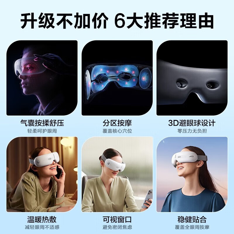 2、整体体验不错,能起到缓解疲劳,几种按摩方式配的音乐也很放松,试过触电震动和气压按摩方式的多款眼部按摩产品,还是气压方式更类似人工按摩,还有加热功能。不压眼球设计不错。
