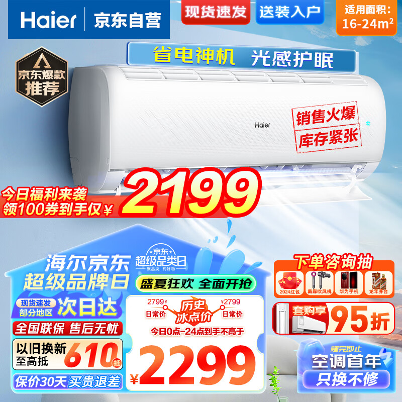 海尔(Haier)空调1.5匹挂机新一级能效变频光感APP智控快速冷暖自清洁大风量卧室壁挂式空调防直吹以旧换新价格:2299.00元!