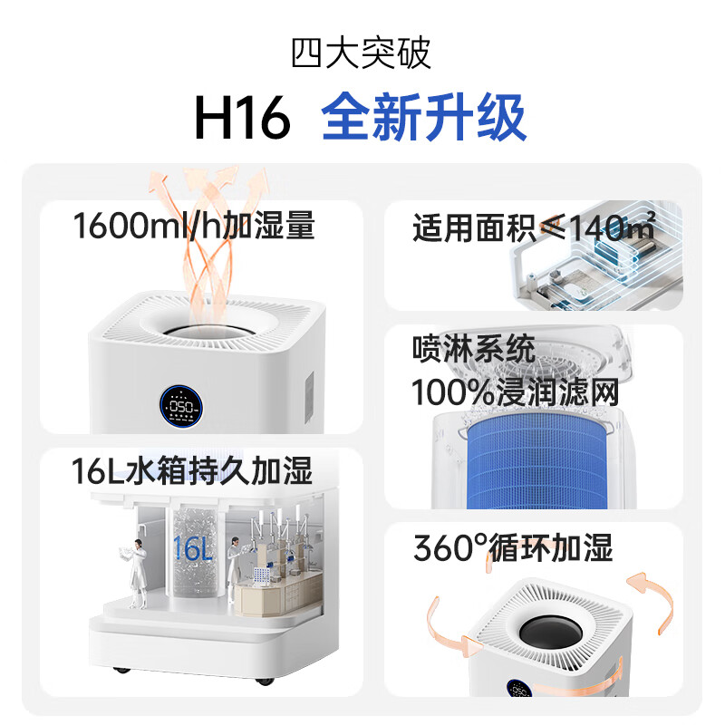 此款airxH16外观我比较的喜欢,质量特别的好,外形设计:很小巧,不占地儿,水箱容量:6L一天不用加水运行声音:几乎静音加湿效果:很不错雾量大小:没有雾