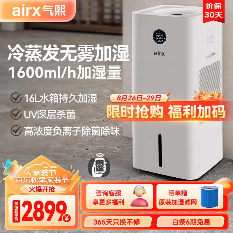 airx气熙 高端无雾加湿器卧室家用办公室桌面 婴儿低噪 16L大容量 上加水 智能恒湿1600ml/h加湿量H16价格:3099.00元!